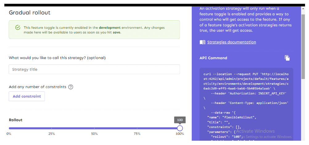 Our feature flag can now be used to control whether or not activity is displayed. If we switch on the gradual roll out: