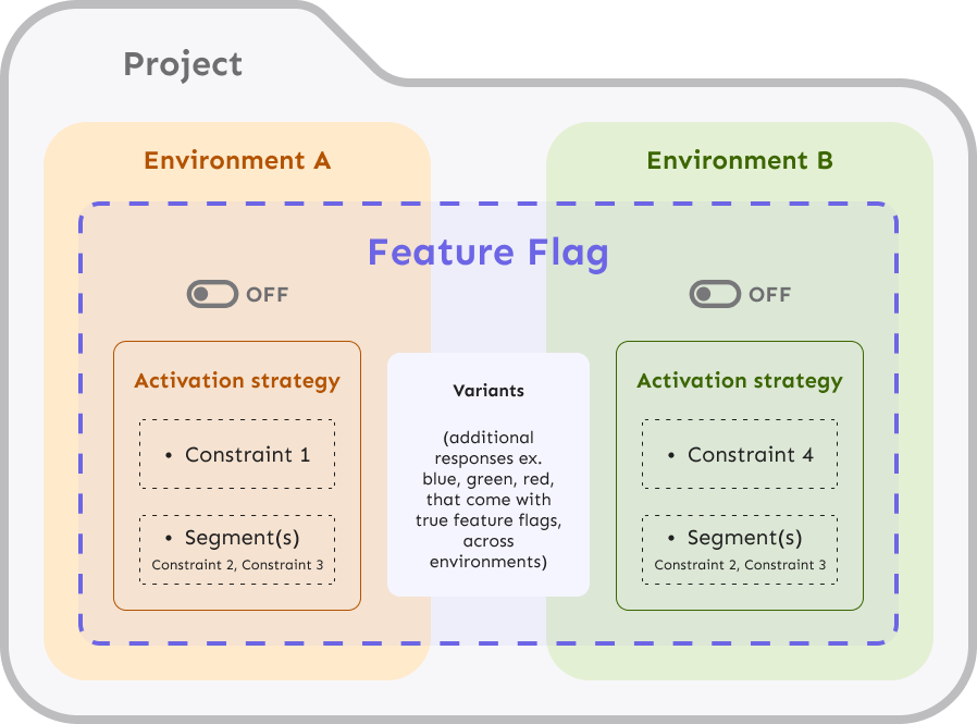 Feature flags are at the heart of Unleash’s functionality. Feature flags belong to projects and live next to project environments. In and of itself, a feature flag doesn’t do anything. You must assign activation strategies to it for it to start taking effect.